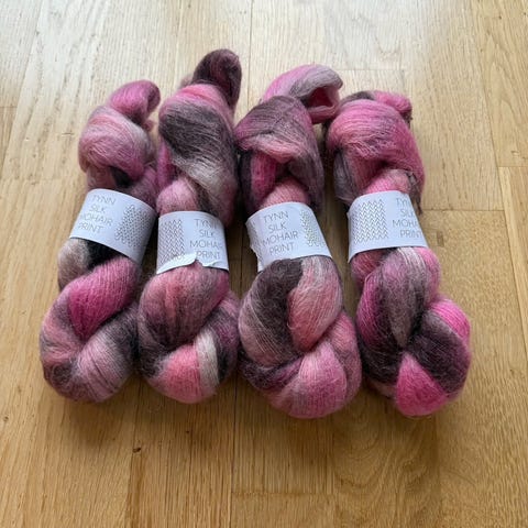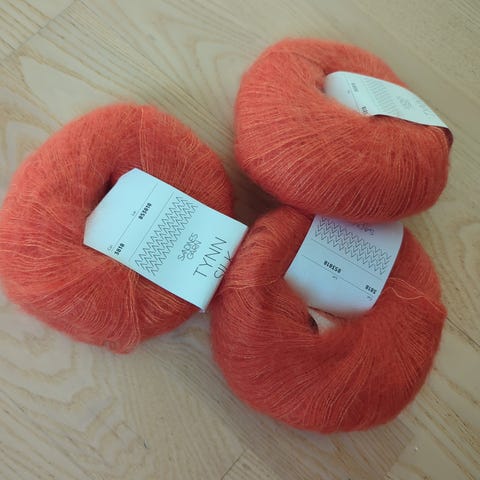 Sandnes Garn Tynn Silk Mohair garnpakke med flere nøster i fargene blå, beige og hvit. Garnet består av en tynn blanding som inkluderer silke og mohair, egnet for strikking av lette og luftige plagg.