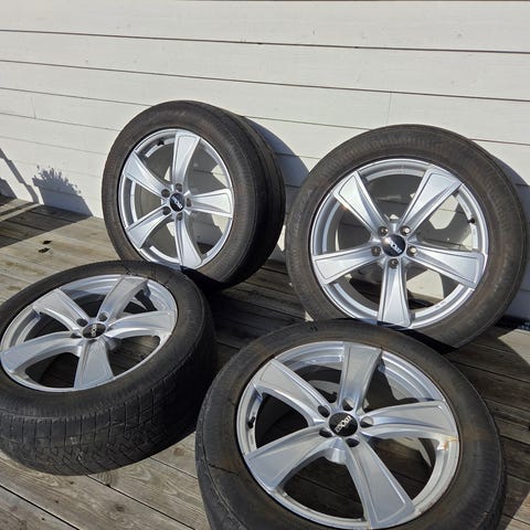 4 pene felger med utslitte Alenza sommerdekk, der ett er punktert.