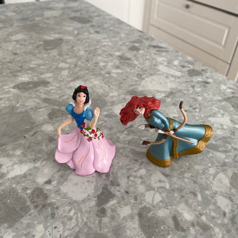 Disney Snøhvit og de syv dvergene figursamling med figurer av Snøhvit, de syv dvergene, den onde dronningen og andre karakterer fra filmen.