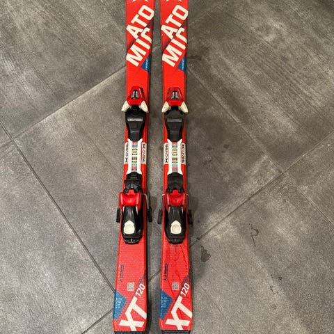 Dette er et par Atomic Redster XT barneski med Atomic-bindinger.