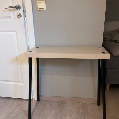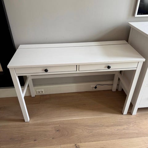 IKEA bord i tre med hvite detaljer. Passer til bruk som spisebord, skrivebord eller arbeidsbord. Må hentes.