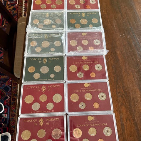 Samling av norske myntsett og myntruller i ulike utgaver. Inneholder flere sett med forskjellige mynter i originalemballasje samt myntruller med norske mynter. Passer for myntsamler eller som referansemateriale.