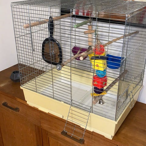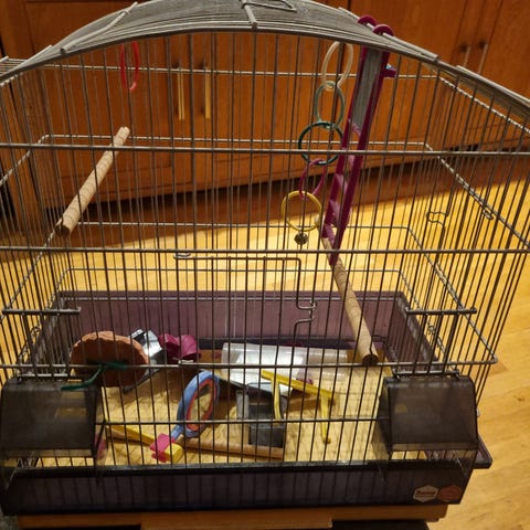 Fuglebur i hvit metall med plastbunn. Passer for små til mellomstore fugler. Bur med husformet tak og flere stenger for oppheng av fugleutstyr.
