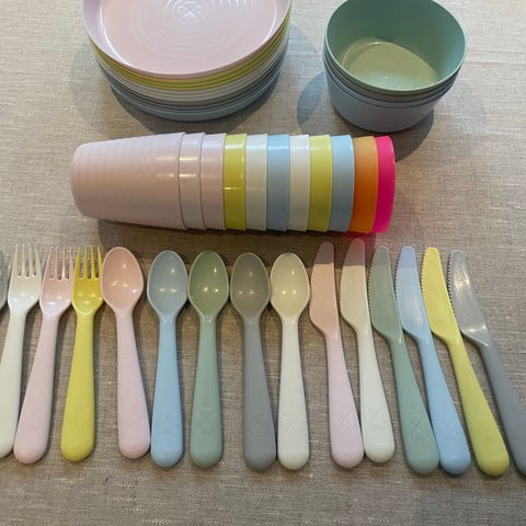 Bestikksett fra IKEA selges. Dette settet har vært en favoritt da den svarte plasten gjør det veldig behagelig å holde i. Det er opprinnelig et sett på 12, men det har forsvunnet noen i årenes løp. Så nå er det 12 gafler, 11 kniver, 11 spiseskjeer og 9 teskjeer. En av gaflene er litt smeltet i plasten og en annen gaffel og en skje er litt ødelagt i metallet, se bilde, men fungerer fint fremdeles.
