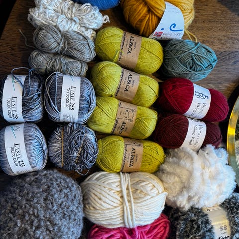 Pakke med garn fra ulike merker i forskjellige farger og materialer. Inneholder flere nøster.