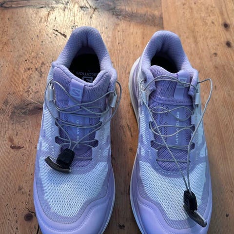 Salomon Ultra Glide løpesko i størrelse 44, svart farge. Skoene er designet for løping og har Energy Foam i sålen for demping og komfort.