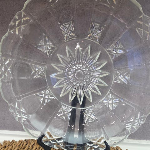 Vintage glassfat med blomsterformet design. Laget i klart glass med detaljer som etterligner blomsterblader. Egnet som dekorativt serveringsfat eller pyntegjenstand.