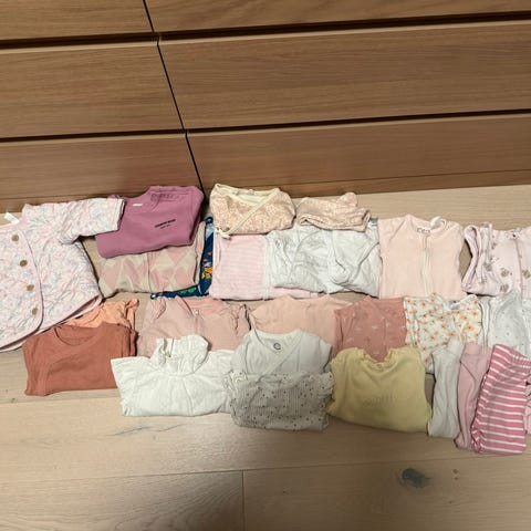 Div babyklær størrelse 62-68 til jente. Bodyer (5 med stropper, 2 stk arm, 4 stk lang arm), 6 pyjamaser, en sommerdrakt, en tights og en strømpebukse, og en litt haug med siklesmekker. Det meste er H&M eller Lindex. Én pysj i ull, ellers bomullsklær.
