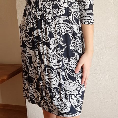 Bik Bok toppe i størrelse L, men den er liten i størrelsen. Toppen har flerfarget mønster og er laget av bomull. Den har trekvart lange ermer og en rund hals.