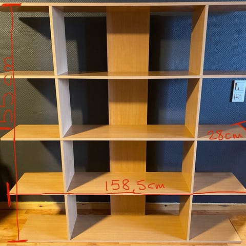 Hylle selges. Kan legges flatt sammen, hyllene er kun festet med treplugger. Noen sprekker og merker, men fungerer helt fint.