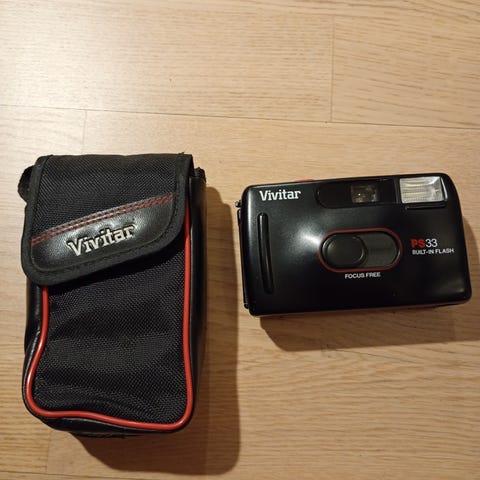 Vivitar PS130 analogt kamera i rød farge. Kameraet har innebygd blitz og manuell filmtransport. Egnet for bruk med 35 mm film.