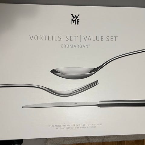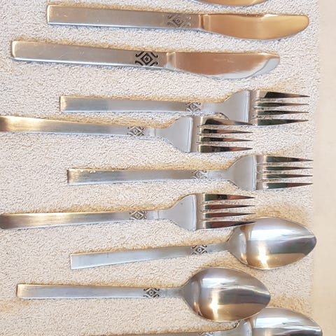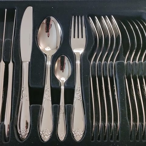 Stort bestikksett som passer til hverdags og/eller til store arrangementer siden det består av 96 deler, 24 stk gafler, 24 kniver, 24 spiseskjeer og 24 teskjeer. Det ene settet er uåpnet i esken, det andre er brukt noen få ganger, fremstår som nytt. Selges samlet.