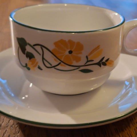 Søt mokka-kopp med underskål, fra 50-60 tallet, pent brukt. FF Figjo Fajansefabrikk, samleobjekt.