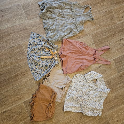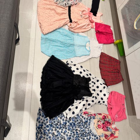 Kjolepakke med ti ulike kjoler som passer 98-104. Både hverdagskjoler og penere kjoler.