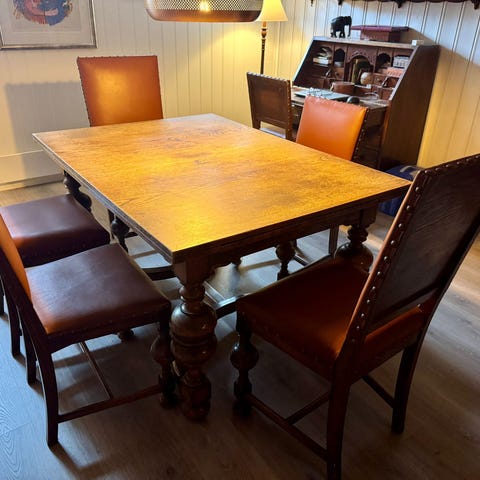 Uttrekkbart heltre styrebord. Ca 100 år gammelt. Sammenslått 160, trekkes ut til mer enn dobbel lengde med fem plater. 12 stoler. NB skinnet er til dels litt skadet. Høyde stoler 126, bredde 55 og dybde 55.