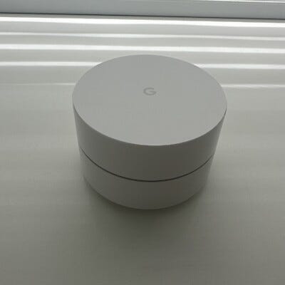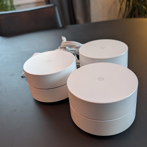 Google Wifi Router 3 stk. beregnet på meshnett, modell AC1304 med tilhørende strømadaptere. Enhetene er designet for trådløst nettverk og dekker hjemmets internettbehov.