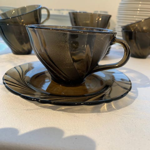 Sett med servise i grønt glass to små boller, tre stk forskjellige tallerkner.