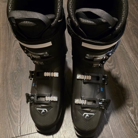 Head Edge Lyt RX GT 90 skistøvler i svart med blå og hvite detaljer. Strl 280/285. Utstyrt med fire spenner for god justering og støtte. Egnet for alpinski og gir god passform for middels til avansert skikjører. Kjøpt 29/11-24, og er brukt en sesong. Støvlene er pene, men har merker og riper etter vanlig bruk i en sesong.