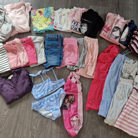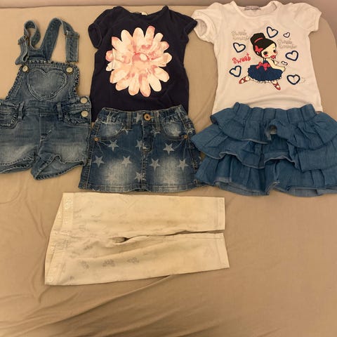 Klespakke med pentopper, skjørt og jumpsuits til jente ca 3 år. Klærne er størrelse 98 eller brukt samtidig.