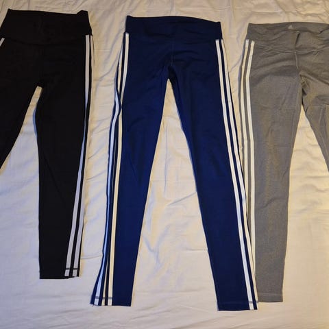 8 tights , 3 shorts, en genser uten armer , en kjole og to stk t shirts. Str fra s og noe i str 134,140, 170 .