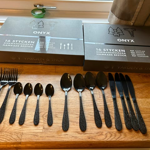 2 sett med Frost Onyx bestikksett med 16 deler i vert sett. Gafler, kniver, skjeer og teskjeer. Designet med et unikt mønster på håndtakene. Egnet for daglig bruk og oppvaskmaskinsikker. Selges samlet for kr 890,- Ordinær pris pr sett kr 995,-