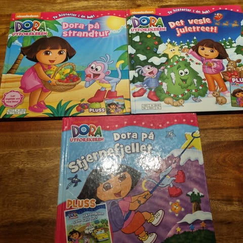Sett med barnebøker med Dora the Explorer-tema. Bøkene er i forskjellige titler og farger, beregnet for barn. Materialet er papir, og bøkene har hardcover omslag. Passer til lesing og underholdning for barn.