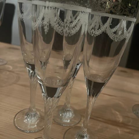 Selger et nydelig sett med 4 gamle champagne / coupeglass i iriserende glass med vakker perlemorglans. Glassene skinner i regnbuefarger når lyset treffer dem og gir skikkelig luksus og Gatsby-stemning på bordet.