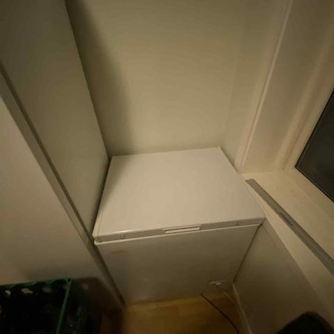 Matsui fryseboks med hvit farge og topplokk. Innvendig er fryseboksen laget med metallflater for enkel rengjøring.