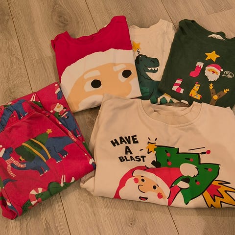 Lindex barneklær i størrelse 122, egnet for både gutter og jenter. Settet består av overdel og bukse med juleinspirert mønster.