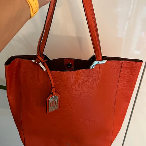 Ralph Lauren dameveske i blått lær. Vesken har snøring som lukkemekanisme og medfølgende liten veske i samme materiale og farge.