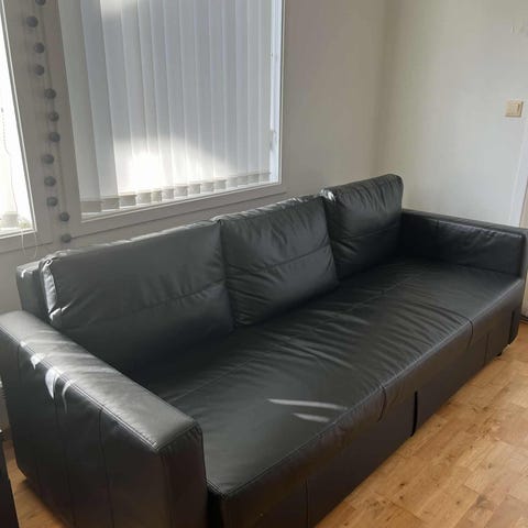 Stilren sovesofa i grå farge. Den har god oppbevaring under sjeslongen. Brukt noen år, men mye bruk igjen. Sovedelen som dras ut er litt bøyd ned (planken under har knekt litt) men skal være lett å fikse.