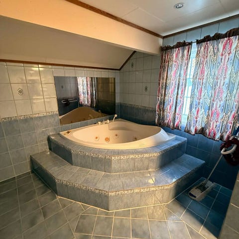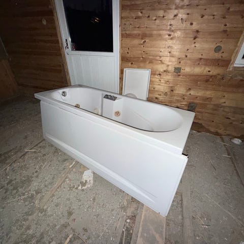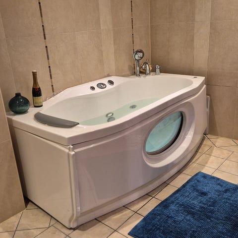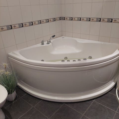 Hjørnebadekar i hvit akryl, 135 x 135 cm. Utstyrt med 6 dyser for vannmassasje. Fungerer som det skal.