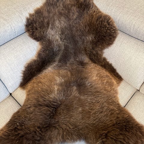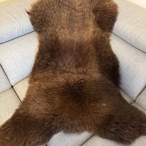 Saueskinn i hvitt. Teppe med lang, myk pels på oversiden. Australsk skinn.