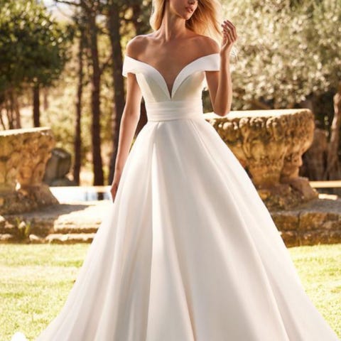 Den er kjøpt høsten 2024 på Maria Schei brudesalong. Kun brukt en gang og er renset. Kjolen er fra Pronovias, og har opprinnelig en pris på 38 000+ skredder.