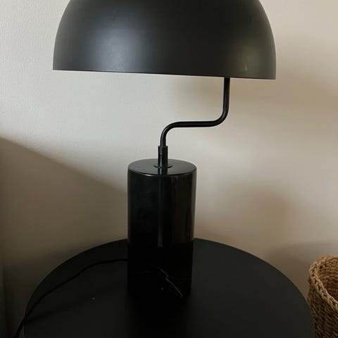 Hvit, frostet glasskuppel på en base i svart metall. For fast installasjon.