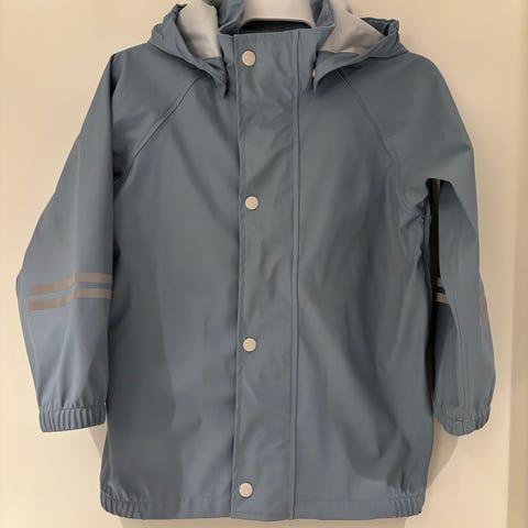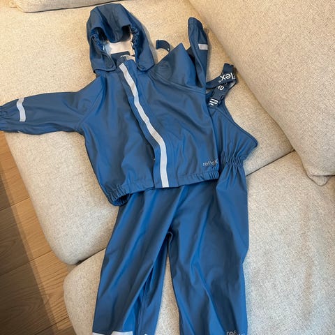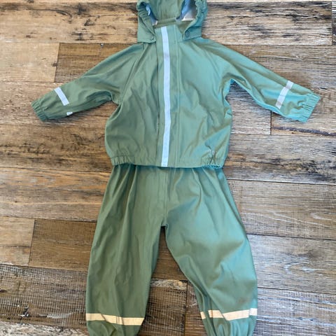 Buksen har ekstra forsterkning på knærne, justerbare seler og utskiftbare fotstrikker som holder den på plass. Jakken har avtakbar hette, stormklaff, elastiske ermer og refleksdetaljer for synlighet. Separate navnelapper i alle deler gjør det enkelt å holde orden i barnehagen.