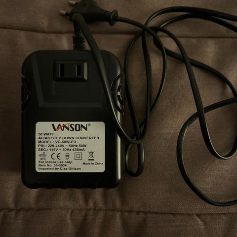 Step-down transformer som er brukt til rørforsterker med amerikansk strømforsyning for konvertering til norsk strøm.