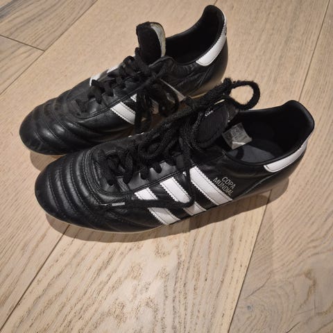 Adidas Copa Mundial fotballsko i størrelse 40 2/3 farge hvit og svart, laget i skinnmateriale. Skoene har tradisjonelt design med tre svarte striper på siden og knotter under sålen for grep på gressbaner.
