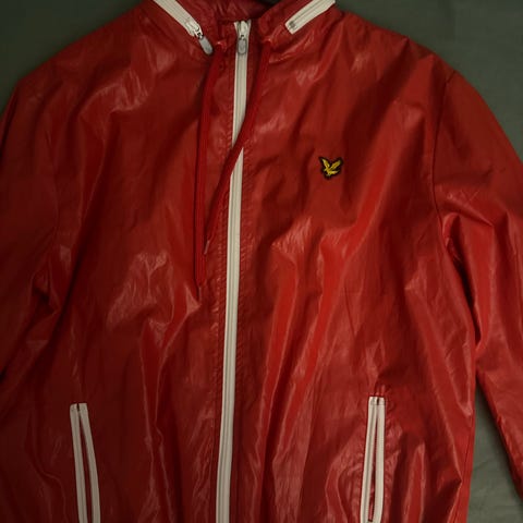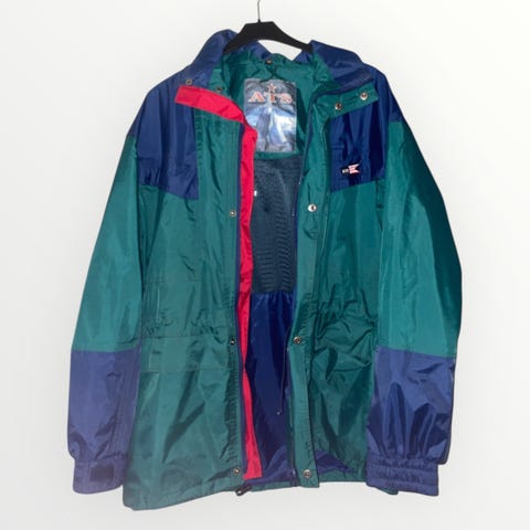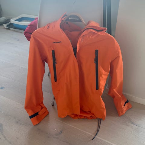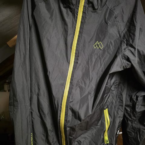 God jakke med snøring i livet og hette. For rundt hals og glidelås for lufting i armhulene. Veldig behagelig jakke.