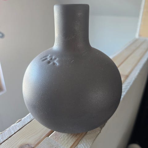 Dette er opprinnelig en vintage gråbrun keramikkvase. Den har blitt sprayet med svart lakkfarge i ulike nyanser. Det er sprayet fire bokstaver i hvit lakk V A S E.