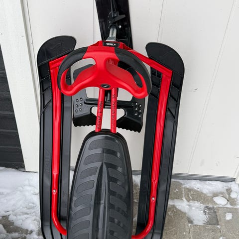Stiga Snowracer akebrett med gul ramme og svart sete. Laget for barn, designet for bruk på snø. Inkluderer styrespak og bremser for bedre kontroll under aking.