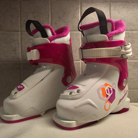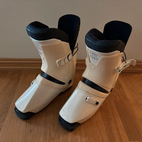 Head skistøvler for barn i størrelse 210 mm Støvlene er svarte med røde spenner og har en solid plastkonstruksjon. Egnet for barn som skal stå på ski.