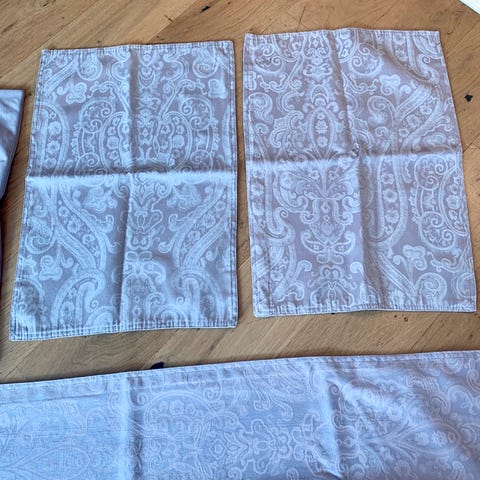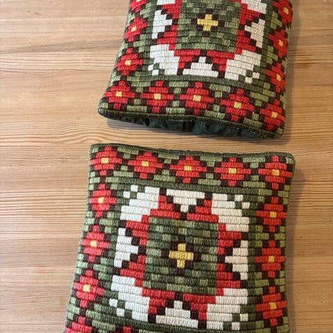 45x45 cm. Fargen er oker eller gul-brun. Fire stk med glidelås.