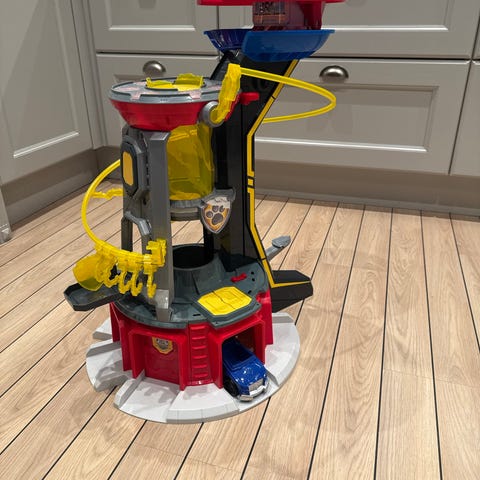 Stort og flott Paw Patrol tårn/ utkikkstårn med alle tilhørende kjøretøy og figurer søker ny eier 🚗 🚙 Tårnet er 80 centimeter høyt, har heis og sklie for valpene. Se bilder!
