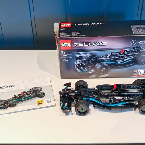 LEGO Technic Mercedes-AMG F1 W11 EQ Performance sett. Modell av Formel 1-bil med detaljerte funksjoner og bevegelige deler. Settets farger er hovedsakelig svart med grønne detaljer på dekkene. Passer for bygging og samling.