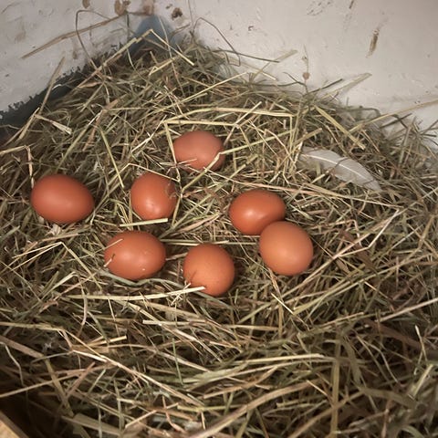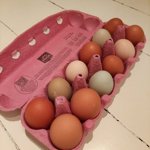 Flokken min består av en ayam cemani hane, noen brun og hvit Lohman og noen mix grønnleggere.