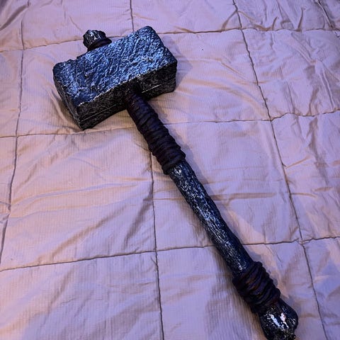Replika av Mjølner hammer med detaljer i metallutseende og dekorative mønstre. Passer som samlerobjekt eller dekorasjon. Noe slitasje på bånd som henger etter skaftet.