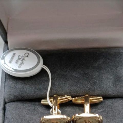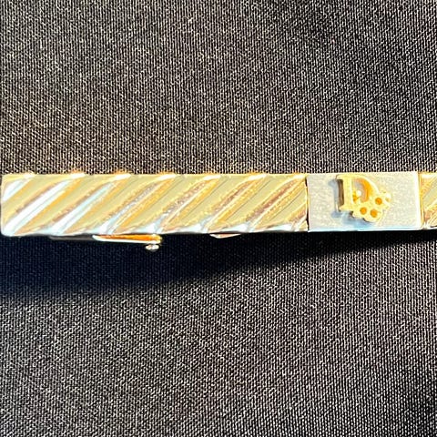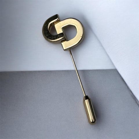 Klassisk Christian Dior slipsnål med logo-design i gull- og sølvfarget metall. Tidløst og elegant til både moderne og vintage antrekk.