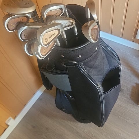 Arvet dette golf sette av min far denne sesongen jeg begynte å spille golf. Settet er litt eldre men fungerer super bra. Baggen er en tralle bag men er mulig å bruke uten tralle da den har en arm stroppe.