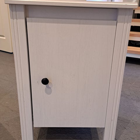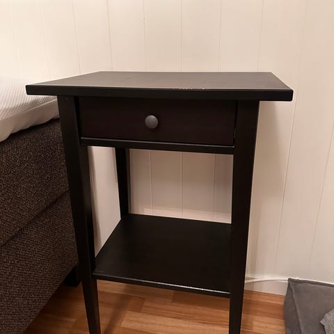 2 solide nattbord, pent brukt og nylig malt i en dus rosafarge. Et av nattbordene har en vannskade på topplaten (malt over), se siste bilde. Denne er lite synlig når nattbordet er i bruk.